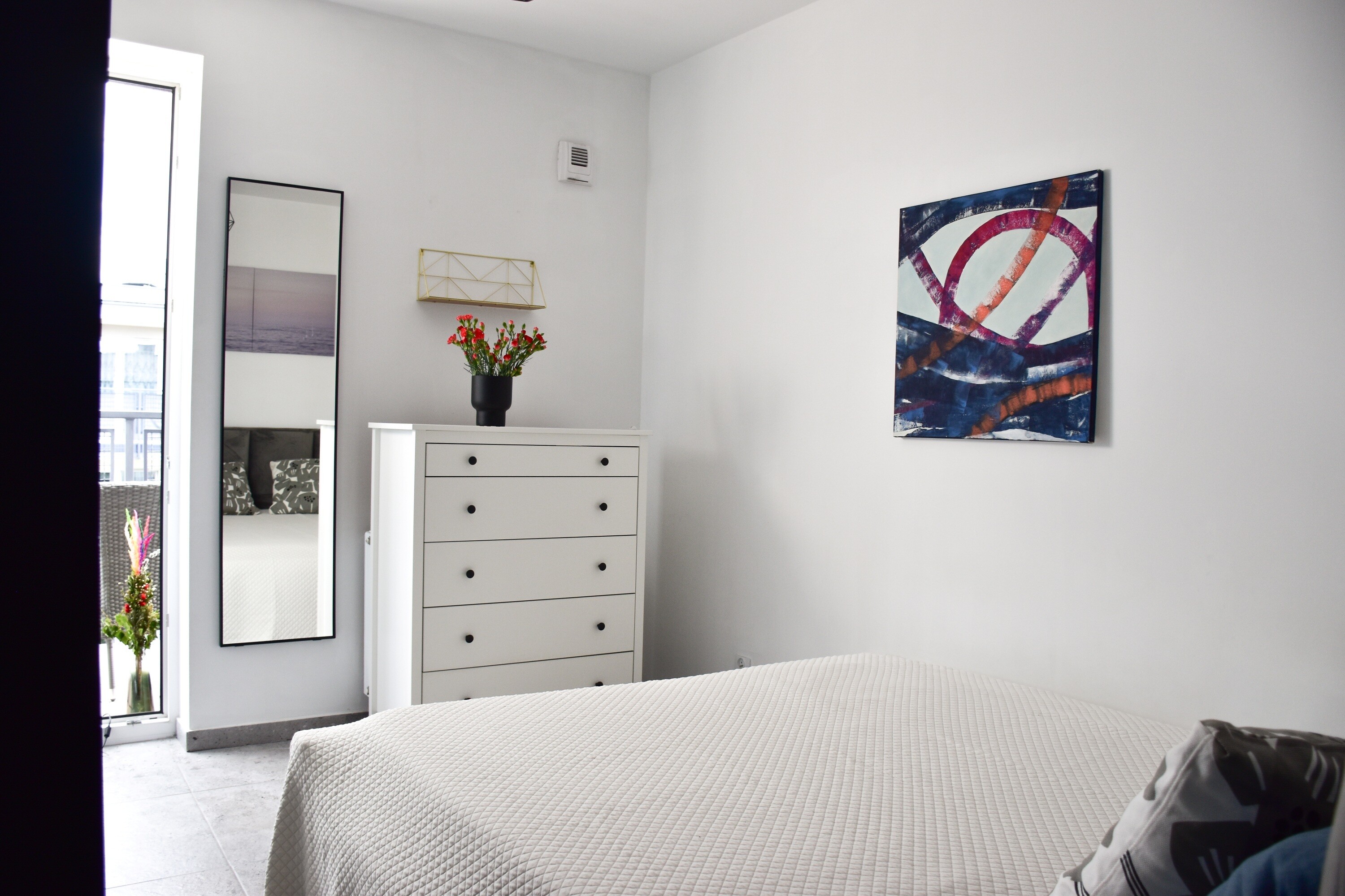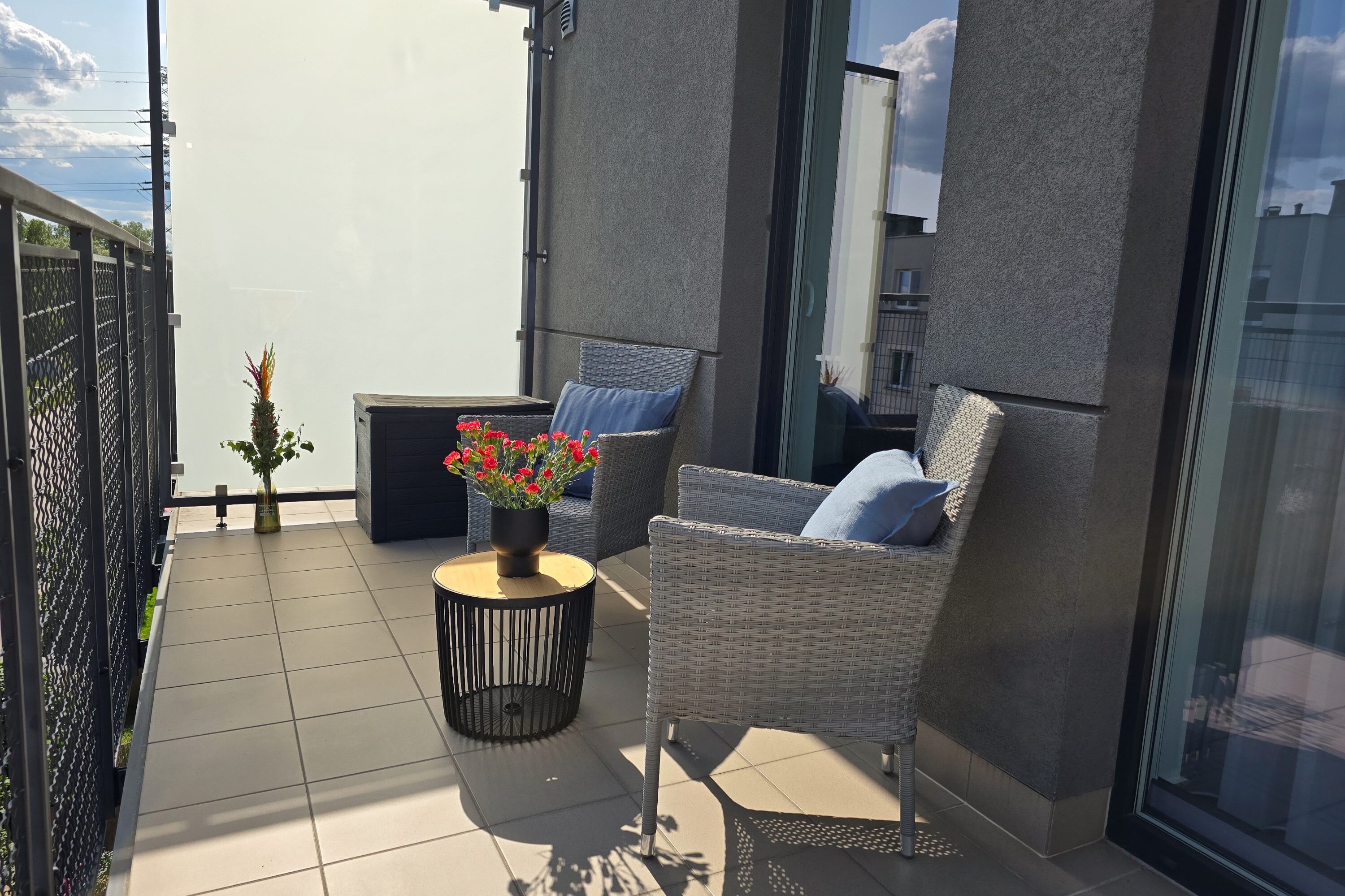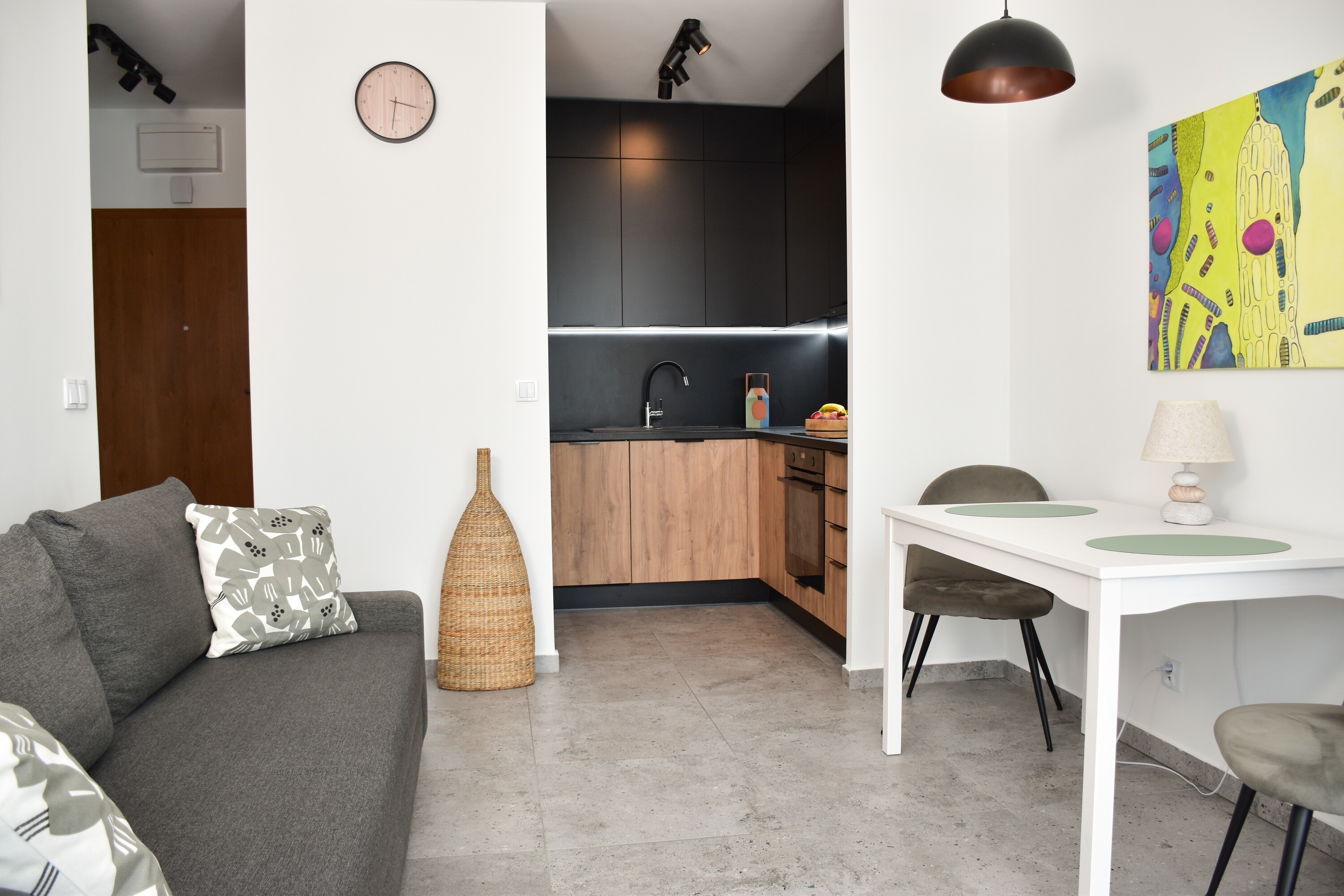 Mieszkanie znajduje się na czwartym piętrze. Składa się z salonu z aneksem kuchennym, sypialni oraz łazienki. Zarówno salon jak i sypialnia posiadają wyjście na duży taras.